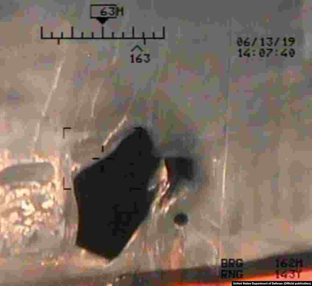 به گفته پنتاگون این تصویر بقایای مین جداشده از بدنه کشتی را نشان میدهد.