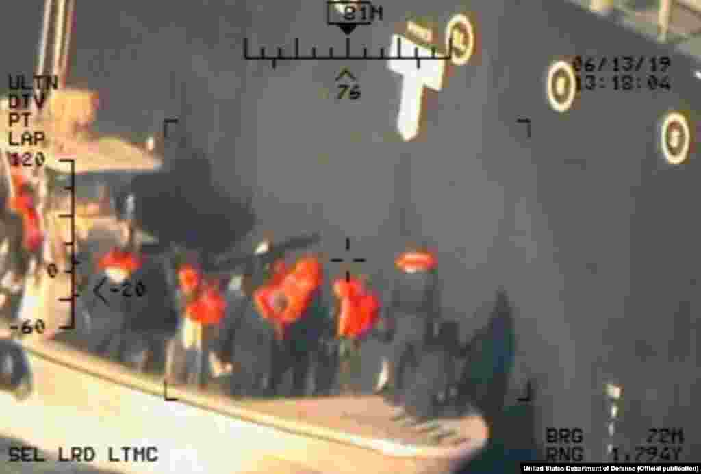 وزارت دفاع آمریکا میگوید این تصاویر نشان میدهد یک «قایق سپاه پاسداران» به کوکوکا کوریجس نزدیک میشود و «یک مین عملنکرده را از بدنه آن جدا میکند».