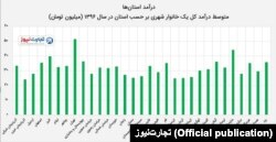 آنگونه که وبسایت تجارتنیوز عنوان میکند، بررسی آمارها نشان میدهد در بین استانهای کشور خانوارهای ساکن استانهای تهران، البرز، مازندران و چهارمحال و بختیاری از درآمد بالاتری برخوردار هستند. همچنین خانوارهای استانهای آذربایجان غربی، کردستان و کرمان کمترین درآمد را نسبت به دیگر استانهای کشور در اختیار دارند.