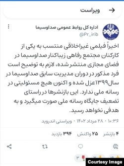 اداره کل روابط عمومی صداوسیما روز شنبه در شبکههای اجتماعی نوشت: «اخیراً فیلمی غیراخلاقی منتسب به یکی از کارکنان مجتمع رفاهی زیباکنار صداوسیما در فضای مجازی منتشر شده، لازم به توضیح است فرد مذکور در دوران مدیریت سابق صداوسیما در سال ۱۳۹۹ عزل شده و اکنون هیچ مسئولیتی در رسانه ملی ندارد.»