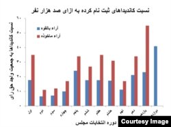 در این نمودار، هر نسبت معادل تعداد کاندیداهای ثبتنامکرده بهازای هر صد هزار نفر از جمعیت در دو دستۀ یادشده است. یعنی برای مثال در مجلس اول بهازای هر صدهزار نفر از جمعیتِ دارای حق رأی، هجده نفر نامزد شدند. اما اگر شمار کسانی که رأی دادند (آراء ماخوذه) در نظر گرفته شود، آنگاه میتوان گفت بهازای هر صدهزار نفری که رأی دادند، ۳۵ نفر کاندیدا شده بودند.