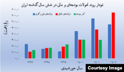 نمودار زیر روند تحولات بودجهای و مالی در شش سال گذشته را نشان میدهد. اعداد سال ۱۴۰۲ بر اساس ارقام تخمینی و قانون بودجه است اما ارقام سالهای قبلی بر اساس آمار رسمی و گزارش تفریغ بودجه دیوان محاسبات به دست آمدهاند.