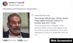 ترامپ مشخص نکرد منظورش دقیقاً کدام اظهارات مقامات تهران است اما در حساب کاربری خود در شبکه تروث سوشیال بدون هیچ توضیحی به گفتوگوی علی شمخانی با شبکۀ انبیسی لینک داد.