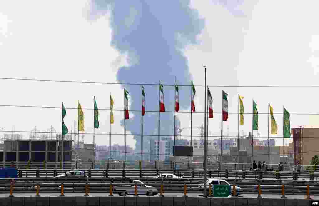 Smoke billows for the second day from the Shahran oil depot, northwest of Tehran, on June 16, 2025.