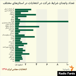 نمودار زیر تفکیک استانی جمعیت واجد شرایط در انتخابات مجلس یازدهم را به تصویر میکشد: