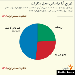 از زاویهای دیگر جمعیت رأیدهنده را میتوان بر اساس نوع سکونت در سه دسته بزرگ روستاها، شهرهای کوچک و متوسط و کلانشهرها توزیع کرد. منظور از کلان شهر بر اساس تعریف رسمی وزارت مسکن شهرهایی در ایران هستند که جمعیت بیش از یک میلیون نفر دارند. در این چارچوب تقسیمبندی آرای بالقوه طبق محل سکونت در نمودار زیر قابل مشاهده است:
