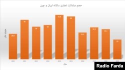 نمودار زیر روند تحولات در حجم مالی مناسبات تجاری ایران و چین در دهه گذشته را نشان می‌دهد: