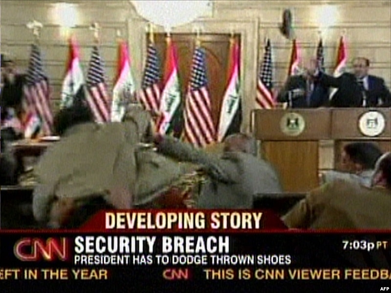 خبرنگار يک شبکه تلويزيونی عراقی در نشست مطبوعاتی مشترک نخستوزير عراق و رئيسجمهوری آمريکا هر دو کفش خود را يکی بعد از ديگری به سوی جرج بوش پرتاب کرد که اگر چه پرتابهای موفقيتآميزی نبود اما نام پرتابکننده را تا مدتها بر سر زبانها انداخت: منتظر الزيدی.