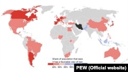 موسسه تحقیقاتی «پیو» (Pew) روز سهشنبه ۲۱ خرداد نتایج یک نظرسنجی را منتشر کرده که در ۳۹ کشور جهان انجام شده و نشان میدهد که ایران نه تنها از نظر سیاسی در جهان منزوی است بلکه در بیشتر کشورها، از جمله در لبنان و مناطق فلسطینی، محبوبیتی ندارد.