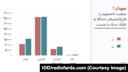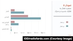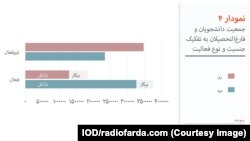 نمودار ۴ به تفکیک زن و مرد نشان میدهد که چه تعداد دانشجو و یا فارغالتحصیل وجود دارد و از این جمعیت چه تعدادی جزو جمعیت فعال و چه تعدادی جزو جمعیت غیرفعال هستند. همچنین مشاهده میکنیم که تعداد جمعیت شاغل و جمعیت بیکار دانشجویان وفارغالتحصیلان چقدر است.