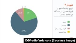 نمودار ۲ نشان میدهد زنان دانشجو و یا فارغالتحصیل در کدام مقطع تحصیلی شاغل بودهاند. همانگونه که در نمودار ۲ قابل مشاهده است بخش عمدهی زنانی که جزو جمعیت دانشجویی محسوب میشوند و یا از دانشگاه فارغالتحصیل شدهاند، در مقاطع بالاتر از کارشناسی شرکت نمیکنند؛ بهطوریکه بیش از ۸۸ درصد این جمعیت دارای مدرک کارشناسی و کاردانی بودهاند.