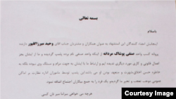 یکی از نامه های کسبه مازندران که خواستار بازگشایی واحد صنفی پلمب شده بهائیان در این استان شد