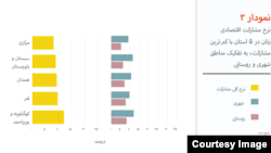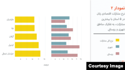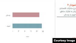 همچنین بر اساس آنچه در نمودار بعدی مشخص است، در ۵ استانی که پایین‌ترین نرخ مشارکت اقتصادی را در بین زنان دارند، نرخ مشارکت زنان در روستاها نیز پایین‌تر از مناطق شهری آن استان‌هاست.