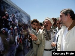 رضا دقتی (وسط) در کنار عبد الله عبد الله -رقیب انتخاباتی کرزای- در افغانستان در جریان برپایی نمایشگاه ویژه و دائمی برای شاه مسعود