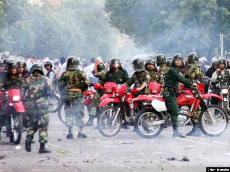 اين گفتهى فرماندهى سپاه که «نمىتوانيم بنشينيم و از طريق سياسى دشمن تغيير ايجاد کند» (آفتاب، ۳۱ مرداد ۱۳۸۸) به خوبى نگرش هيئت حاکمه را به نقش سپاه براى فعاليت سياسى مستمر و جلوگيرى از فرايندهاى دمکراتيک بازتاب مىدهد. نقش نيروهاى نظامى از اين ديدگاه، قرار گرفتن در خط اول جبههى مبارزهى سياسى با مخالفان سياسى با اتکا بر قدرت نظامى و هرگونه نقض حقوق بشر براى ممانعت از هر گونه تغيير دمکراتيک است. بنا به اين ديدگاه فعاليتهاى نرم (سياسى) بر عهدهى اين نيروها گذاشته مىشود: «بسيج بايد توليد قدرت نرم و استمرار روح نشاط و تعالى و افزايش آگاهىهاى سياسى، فرهنگى و اجتماعى را دائما پيگيرى نمايد زيرا سپاه پاسداران انقلاب اسلامى و بسيج يک سازمان ايدئولوژيک است و بر اساس عقيده و مکتب انقلابى عمل مىنمايد.» (آفتاب، ۳۱ مرداد ۱۳۸۸)