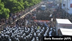 خبرگزاری رویترز میگوید درگیری پس از آن آغاز شد که معترضان به سمت پلیس ضد شورش بطری، سنگ و سایر اشیاء پرتاب کردند.