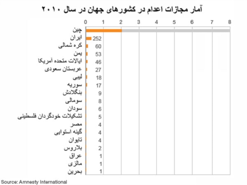 سازمان عفو بينالملل در بررسی آمار اعدام در سال ۲۰۱۰، سال گذشته ميلادی، اعلام کرد که به رغم آمار بالای اعدام در کشورهايی چون چين، ايران، يمن و عربستان سعودی و آمريکا، درصد اجرای مجازات اعدام در این سال کاهش داشته است.