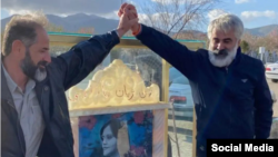 در تصویر دیگری، پدر محمدمهدی کرمی و پدر مهسا امنیتی در حالی که دستهای خود را به نشان اتحاد و همبستگی گره کردهاند بر مزار مهسا امینی در آرامستان آیچی شهر سقز ایستادهاند.