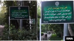 ایسنا در گزارش خود مینویسد که تابلوهای مذکور توسط پلیس پارکها نصب شده است.