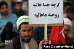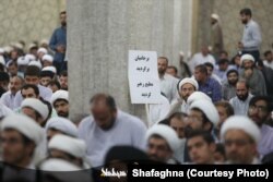 شاید تنها شعار‌نوشته کمتر سیاسی تایپی یا چاپی این تجمع٬ این پیام باشد که در دست این روحانی دیده می‌شود که مضمون آن اقتصادی و معیشتی است.